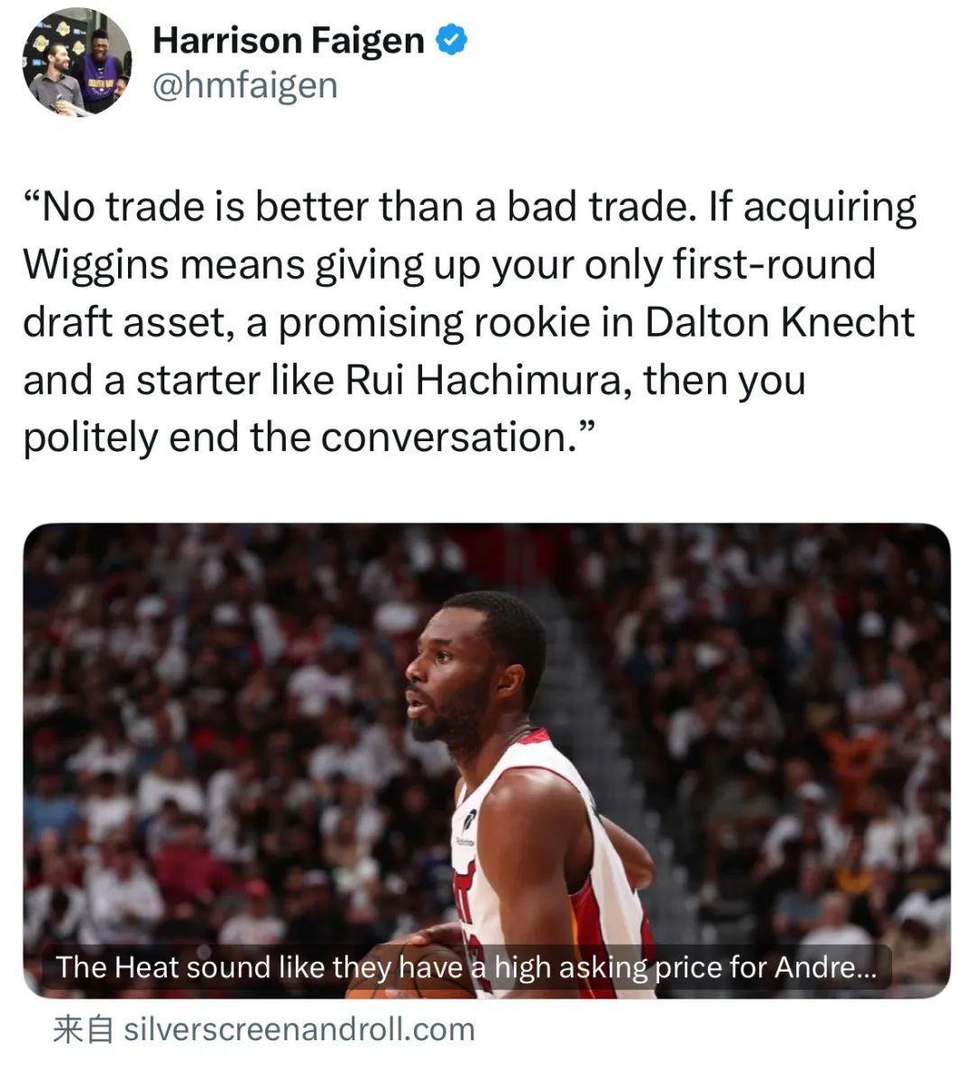 现湖人记者Faigen对此发表评论:没交易好过烂交易,如果对方过于狮子大开口,那么就该礼貌结束谈话。